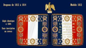 Huit ans plus tard, il est remplacé par un nouveau modèle, dit de 1812. C'est une étoffe composée de trois couleurs, bleue, blanc et rouge, en bandes verticales dont les dimensions sont de 33 pouces de côtés (90 cm), non compris la frange, pour les corps de troupe à pied, et de 22 pouces de côtés (60 cm), pour les corps de troupe à cheval. Aux angles supérieurs se trouve la couronne impériale ; aux angles inférieurs l’image d’un aigle ; les unes comme les autres entourées par une couronne de chêne contenant l’initiale de l’Empereur. La hampe à 8 pieds de haut et la cravate descend jusqu’à la moitié du tablier. La bordure entière est brodée en or avec quelques ornements, des abeilles et des étoiles. Il porte à l’avers « l’Empereur Napoléon au 1er régiment du corps impérial de la marine » et sans inscription au revers. Il n’y a pas de remise officielle du drapeau.