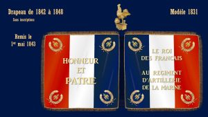 Lors de la formation du régiment en 1822, aucun emblème n’est attribué par le Roi. Cet oubli sera corrigé par décision royale du 26 octobre 1842. Le colonel Préaux, commandant le régiment d’artillerie de marine, reçoit officiellement le drapeau le 1er mai 1843. La restauration avait aboli le dispositif d’inscription des noms de bataille. Le drapeau est tricolore. L’étoffe, en soie, bordée par des franges d’or, porte d’un côté les mots « Le Roi des Français à tel régiment » et de l’autre la devise de la Légion d’Honneur « Honneur et Patrie ». Au sommet de la hampe est fixé un coq en bronze doré, aux ailes légèrement déployées, dit coq gaulois.