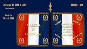 L’emblème est tricolore avec une hampe surmontée d’un fer de lance en bronze doré. Sur la partie flottante, d’un côté est inscrit « Unité Liberté Egalité Fraternité » entourant l’inscription « République Française ». Au revers est brodé en lettre d’or le numéro du régiment et l’inscription « Valeur et Discipline ». Les anciens drapeaux et étendards sont versés dans les directions d’artillerie.